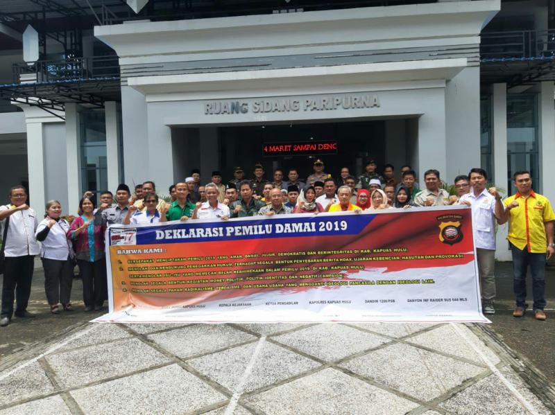 Para Calon Legislatif (Caleg) dari beragai Partai Politik (Parpol) di Kabupaten Kapuas Hulu menegaskan komitmennya dalam acara deklarasi yang diadakan Polres Kabupaten Kapuas Hulu, di Aula DPRD Kabupaten Kapuas Hulu, belum lama ini. Terdapat.