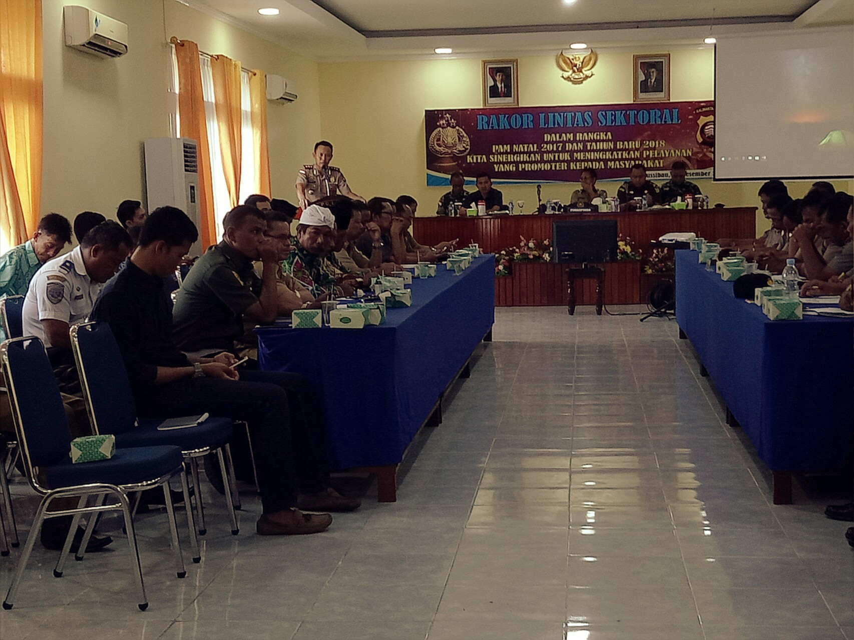 SelengkapnyaPolres Kapuas Hulu menggelar Rapat Koordinasi (Rakor) Lintas Sektoral dalam rangka pengamanan Natal Tahun 2017 dan Tahun baru 2018, di Aula Mapolres, Selasa 19 Desember 2017. Rakor tersebut melibatkan Forkompinda serta jajaran Organisasi Perangkat.