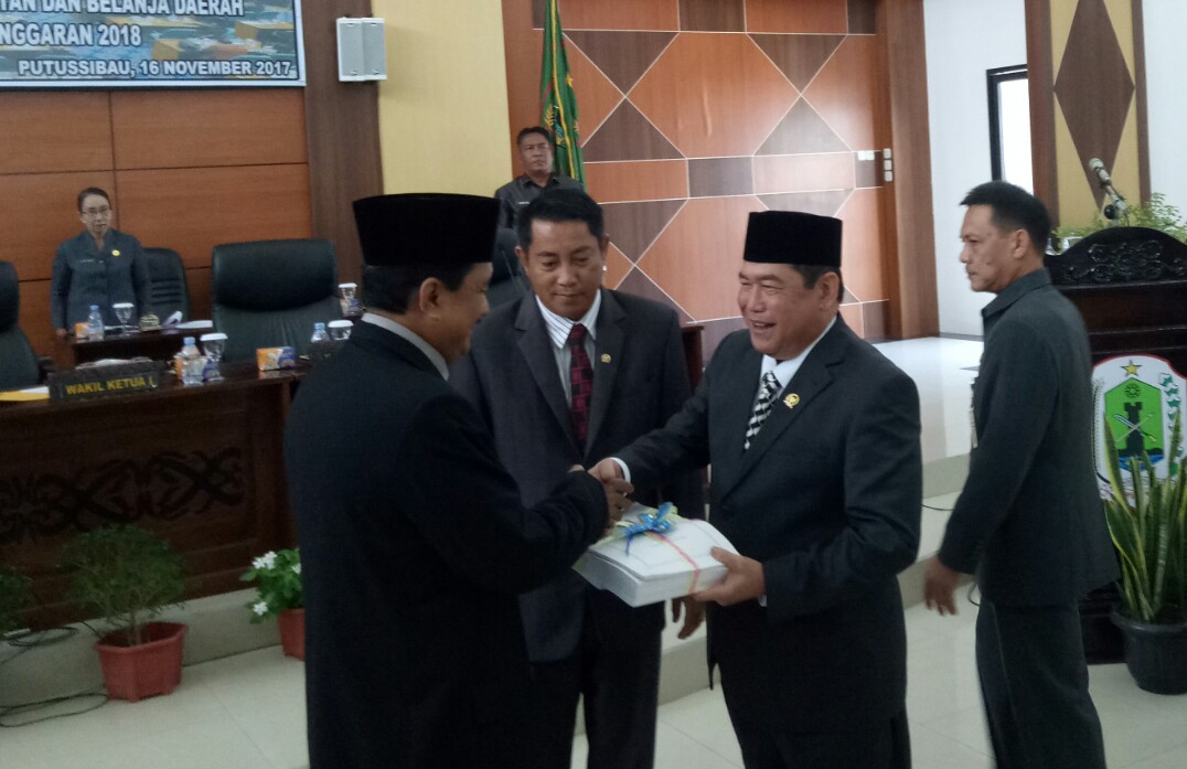 SelengkapnyaBupati Kapuas Hulu, AM. Nasir, S.H menyerahkan nota keungan Rancangan Peraturan Daerah (Raperda) Anggaran Pendapatan dan Belanja Daerah (APBD) Kabupaten Kapuas Hulu, Tahun Anggaran 2018 kepada jajaran Legislatif Kapuas Hulu, Kamis 16 November 2017,.