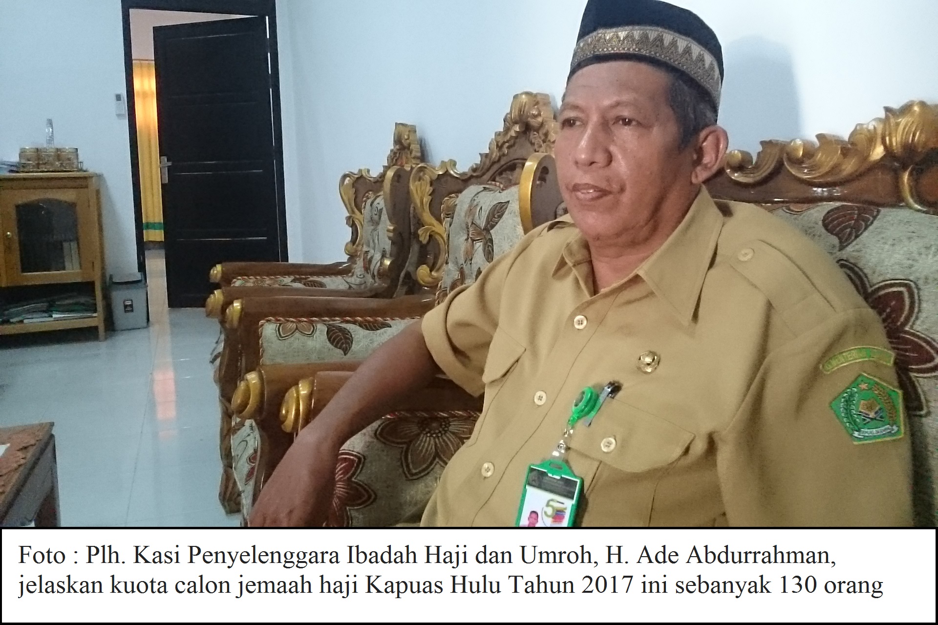 SelengkapnyaPlh. Kasi Penyelenggara Ibadah Haji dan Umroh, H. Ade Abdurrahman mengatakan, kuota calon jemaah haji Kapuas Hulu Tahun 2017 ini sebanyak 130 orang. Dari jumlah tersebut sudah terisi semua. "Kuota Tahun sebelumnya 95 orang berangkat, Tahun ini.