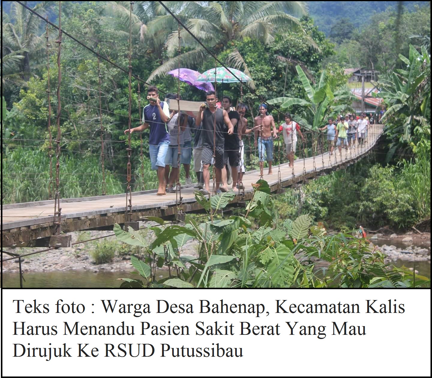 SelengkapnyaPemberitaan warga Desa Bahenap yang sakit harus ditandu untuk berobat ke rumah sakit di Putussibau, menuai keprihatinan banyak pihak. Salah satunya Kepala Dinas Kesehatan Kabupaten Kapuas Hulu, dr H. Harisson, M.Kes. Ia mengaku prihatin dengan.