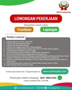 Lowongan Pekerjaan KSP Lantang Tipo. Silahkan dimanfaatkan kesempatan dan lowongan pekerjaan berikut The post Lowongan Pekerjaan KSP Lantang Tipo appeared first on Info Kapuas.